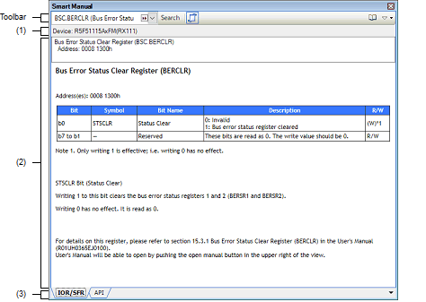 Selecting a tab allows you to switch which specifications of registers or API functions are displayed in the manual area.