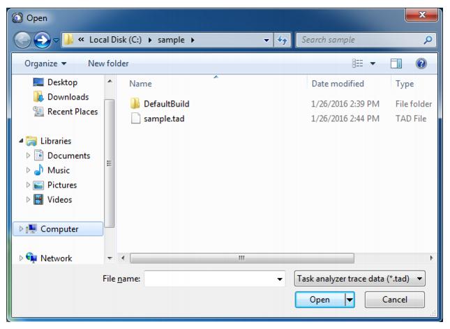 When selecting the [Open trace data....] on the drop-down list, select/specify the folder and the file in which the task analyzer trace data is stored, in the
