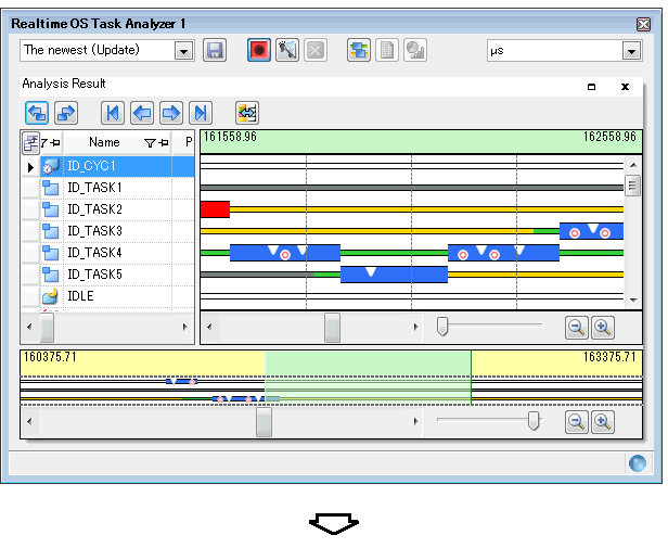 By pressing the button located on the Toolbar on the Realtime OS Task Analyzer panel, the user can clear the analysis information that is displayed in the Child-panel display area.