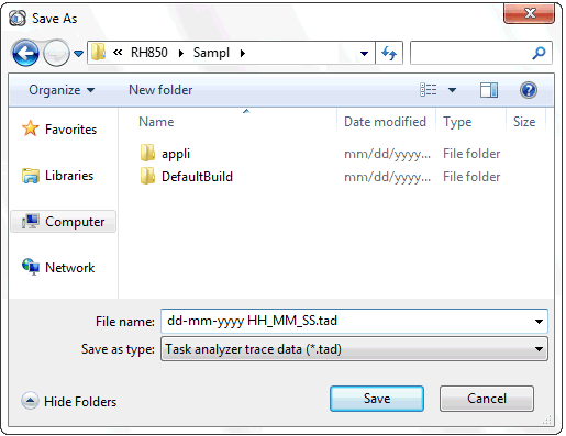 Where the task analyzer trace data is to be saved and the file name by which it is to be saved can be selected/specified on the Save As dialog box which is opened when the