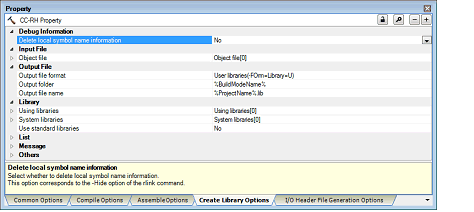 To set options for the librarian, select the Build tool node on the project tree and select the [Create Library Options] tab on the Property panel.
