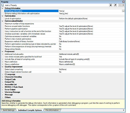 You can set compile options for the C source file by setting the necessary properties in this tab.