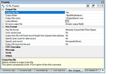 To set options for the hex output phase, select the Build tool node on the project tree and select the [Hex Output Options] tab on the Property panel.