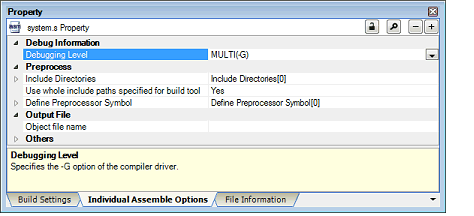 This tab shows the detailed information on an assemble source file categorized by the following and the configuration can be changed.