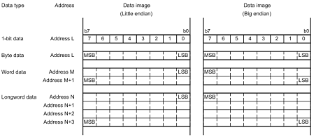 Data in memory have three sizes; byte (8-bit), word (16-bit), and longword (32-bit). The data arrangement is selectable as little endian or big endian. Figure 1.7 shows the arrangement of data in memory.