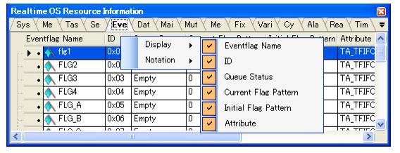 To select which items are displayed, right click on the header (header column or row) in the Realtime OS Resource Information panel, and from the context menu that appears, select "Display".