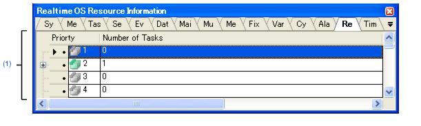 This tab displays the ready queue information (e.g. Priority and Task Num) of the RI600PX.