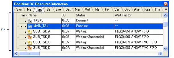 Note that if the task's current state is other than waiting state for an eventflag, sending waiting state for a data queue, or waiting state for a variable-sized memory block, "--" is shown.