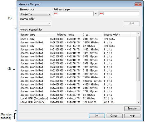 Adds the content specified in this area to memory mapping. The added memory mapping is displayed in the [Memory mapped list] area. The changes will not take effect until the [OK] button is clicked. |