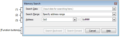 Searches downward within the range specified in the [Address] area or the [Search Range] area. The location found by the search is selected in the Memory panel. Note that if an illegal value is specified or while the program is being executed, a message will appear, and the memory search will not be performed. If focus moves to this dialog box while the memory panel is hidden or another panel has focus, then this button will be disabled. |