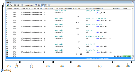 This panel is used to display trace data recording the execution history of the program (see "2.13 Collect Execution History of Programs").