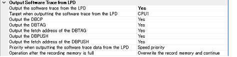 Software tracing through LPD output can be configured in the [Trace] category on the [Debug Tool Settings] tab of the Property panel.