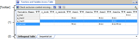 There are two tabs: [Orthogonal Table] tab which displays the functions that access variables in the form of an orthogonal table and [Sequential List] tab which displays time-series information on exclusive control that was measured by the exclusive control checking tool.