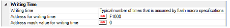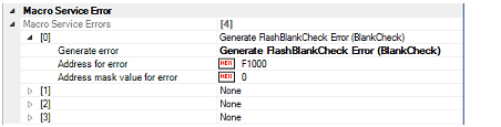 Four types of errors to generate ([0]/[1]/[2]/[3]) can be specified with subproperties for this property. Select any one of the following types from each of the [Generate error] subproperties to return the error values forcibly, and then specify the address within the data flash memory (0xF1000 to 0xFFFFF) and its mask value (0x0 to 0xFFFFF) at which the corresponding function error is to be generated, with the [Address for error] and [Address mask value for error] subproperties that are listed newly in the lower area.