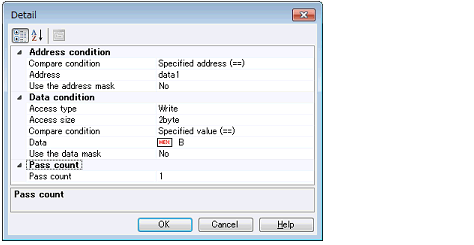 The address condition, data condition and pass count condition [IECUBE][Simulator] for access-related events you have set can be edited.