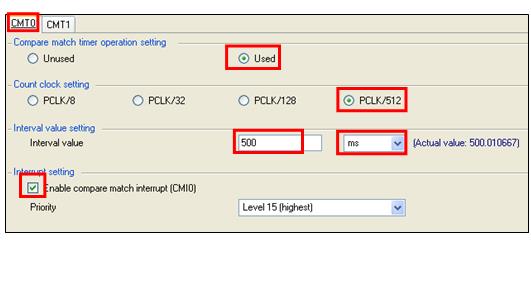 Double-click the [Code Generator (Design Tool)] > [Peripheral Functions] > [Compare Match Timer] in the Project Tree. This opens the panel for the compare match timer. |