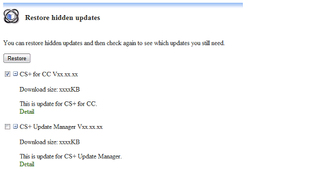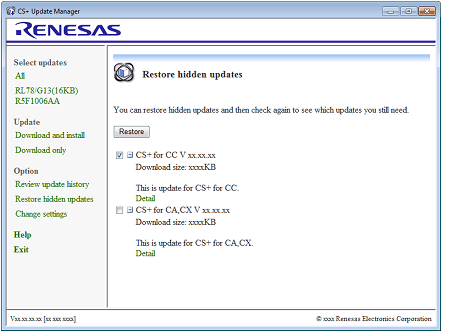 In the menu area of the CS+ Update Manager window, select [Restore hidden updates] to display the Restore hidden updates page.