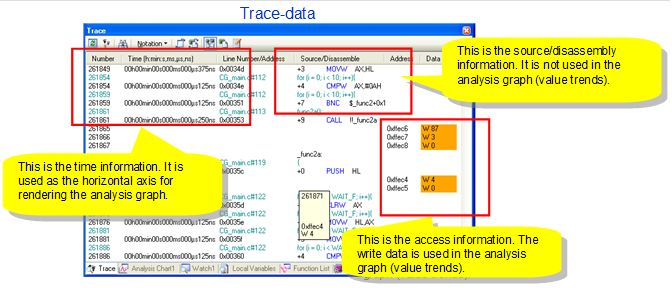 The figure below shows the Trace panel. When you use the trace function, this panel appears when you select [View] -> [Trace] from the menu. As shown in the figure, the analysis graph showing the Variable Value Changing Chart only uses time and access information.