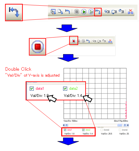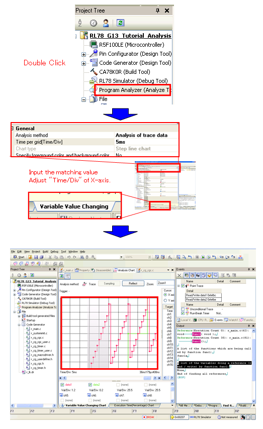 In Analysis Chart 1, click the Trace Data Analysis icon, and run the program. Next, stop program execution. |