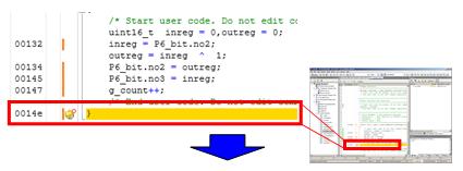 Let's see how the variable you registered to the watch window changes by setting a software break and running the program.