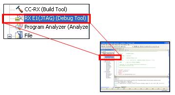 Right-click on the Debug Tool in the Project Tree and select [Using Debug Tool] > [RX E1(JTAG)]. |