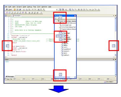You can save up to four panel layout states for before and after connecting to the debugging tool. To do so, from the menu bar, select [View] > [Save or Restore Docking Layout].
