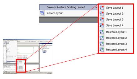 You can save up to four panel layout states for before and after connecting to the debugging tool. To do so, from the menu bar, select [View] > [Save or Restore  Docking Layout].