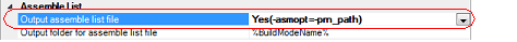 To output the assemble list file, select [Yes(-asm_option=-prn_path)] in the [Output assemble list file] property in the [Assemble List] category.
