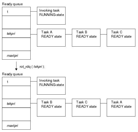 Note 1 This service call does not perform queuing of rotation requests. If no task is queued to the ready queue corresponding to the relevant priority, therefore, no processing is performed but it is not handled as an error.