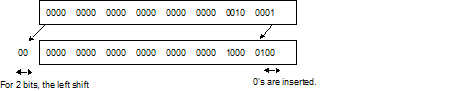 Zeros equivalent to the specified number of bits shifted move into the low-order bits.