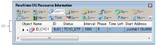 This tab displays the cyclic handler information (e.g. Cyclic Handler Name and ID) of the RI850V4.