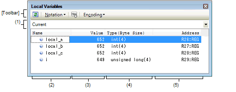 The meanings of the marks and colors displayed as the values of the local variables are as follows (character colors and background colors depend on the configuration in the [General - Font and Color] category of the Option dialog box):