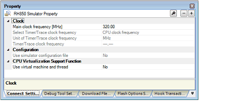 The CPU clock operates on the frequency set up with the [Main clock frequency [MHz]] property on the [Connect Settings] tab.