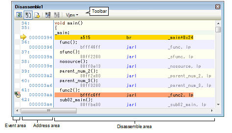 For details on the contents and function in each area, see the section for the Disassemble panel.
