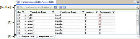 There are two tabs: [Orthogonal Table] tab which displays the functions that access variables in the form of an orthogonal table and [Sequential List] tab which displays time-series information on exclusive control that was measured by the exclusive control checking tool.