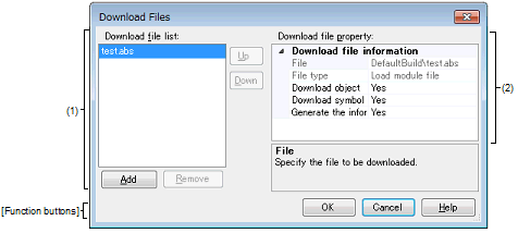 Displays a list of files to download. The names of files specified as build targets in a project (main project or sub-project) are displayed by default (they can be removed).