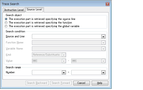 Select the [The execution part is retrieved specifying the source line] item in the [Search object] area and then follow the operation below.