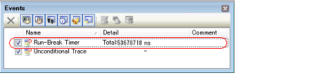 After the program is stopped, the result of the measurement is displayed in the Events panel that is opened by selecting the [View] menu >> [Event], in event type as "Run-Break Timer".