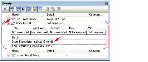 When a timer start event and a timer end event are set, they are managed collectively on the Events panel as one instance of a Timer Result event (see "2.15 Manage Events"). When you click the "+" mark at a Timer Result event item, detailed information on the timer start event and the timer end event you have set is displayed.