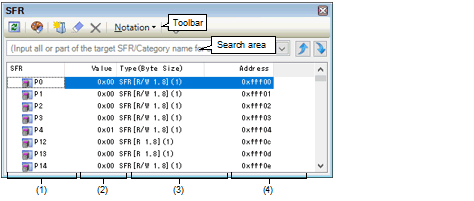 Contents of the SFR can be displayed and its values can be changed in the SFR panel below.