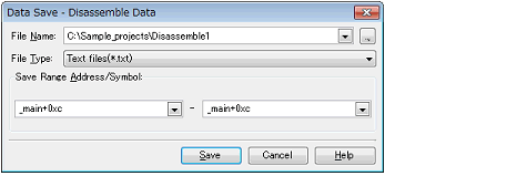 The Data Save dialog box can be opened by selecting the [File] menu >> [Save Disassemble Data As...] (when this operation takes place with the range selected on the panel, the disassembled data can be saved only for the selected range).