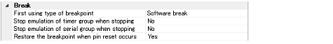 When [No] is selected, the breakpoints are ignored and not restored after a pin reset, but are restored when the program is stopped.