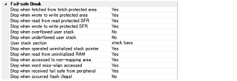 This function has various break conditions. Enable/disable each break condition in the [Fail-safe Break] category on the [Debug Tool Settings] tab of the Property panel.