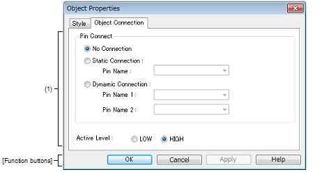 This property dialog box is used to set or change the connection information fed to the pins of figure object (including text and bitmap) of the I/O Panel window.