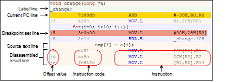 Following the source text line concerned, a disassembled result line is displayed as shown below.