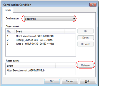 To register a reset event, click the [R Event] button. This button is enabled only when you've selected Sequential for the combination condition and moved the caret to an event in the Object event list.