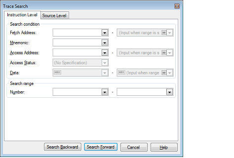 The character string specified here is searched from within the [Source/Disassemble] area of the Trace panel.