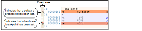Since a breakpoint is set as a break event and managed as an event, restrictions apply to the number of breakpoints that can be set. Also see "2.17.1 Changing states of setting (Enabled/Disabled)" for details on breakpoint settings, including the allowable number of valid events.