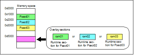 The optimizing linkage editor (Optlnk) used by the CC-RX provides the start option, which allows two or more sections defined in a program to be allocated to a single address. Sections that have been allocated in this way are called overlay sections.