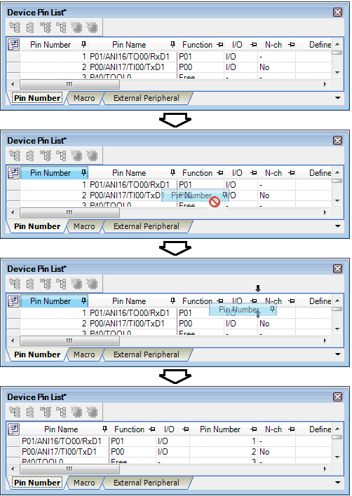 In Pin Configurator, you can change the display order of columns in the device pin list (move columns) by dragging and dropping columns.